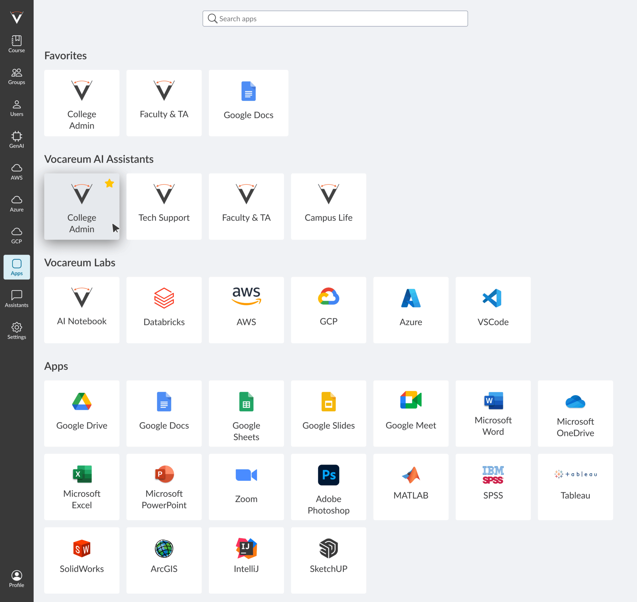 The Vocareum Digital Backpack centralizes access to every academic tool—desktop software, cloud labs, AI assistants, content, and credentials—into one governed, student-first hub. Launch from the LMS (LTI 1.3), sign in once (SSO), enforce budgets and guardrails for GPUs/LLMs, and stream professional apps (e.g., MATLAB, AutoCAD, SPSS, Adobe) to any device