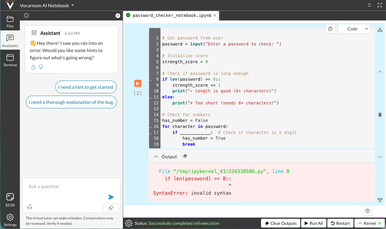 Vocareum AI Notebook is a cloud-based, Jupyter-powered platform specifically designed for data science and AI education. It’s truly an ‘All-In-One’ canvas, centralizing all essential AI resources: full Jupyter compatibility, pre-configured GenAI API keys, GPU access, built-in AI Assistants and tutors, and robust assessment tools. This eliminates complex setups and enables instant, hands-on learning.
